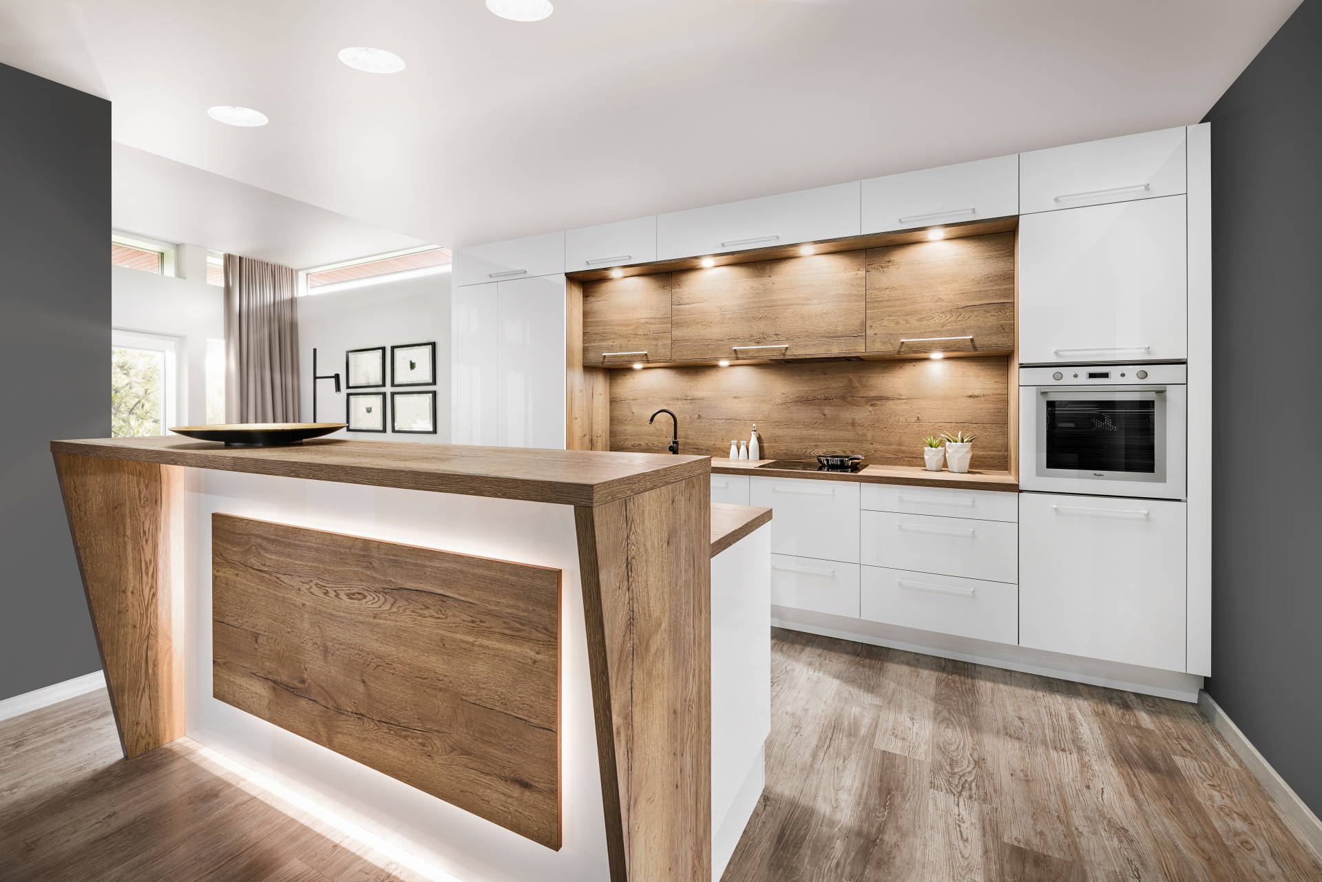 Bryła wyspy jest dominującym elementem wystroju wnętrza, nadając charakter nie tylko kuchni, ale i strefie dziennej, dlatego musi harmonijnie łączyć stylistykę zabudowy meblowej w obu strefach. Duże znaczenie ma odpowiednia kolorystyka i wybrane dekory. Wśród najbardziej popularnych znajdują się wzory drewna i kamieni, ale atrakcyjne są także odwzorowania betonu czy popularne obecnie matowe wybarwienia w monokolorze.